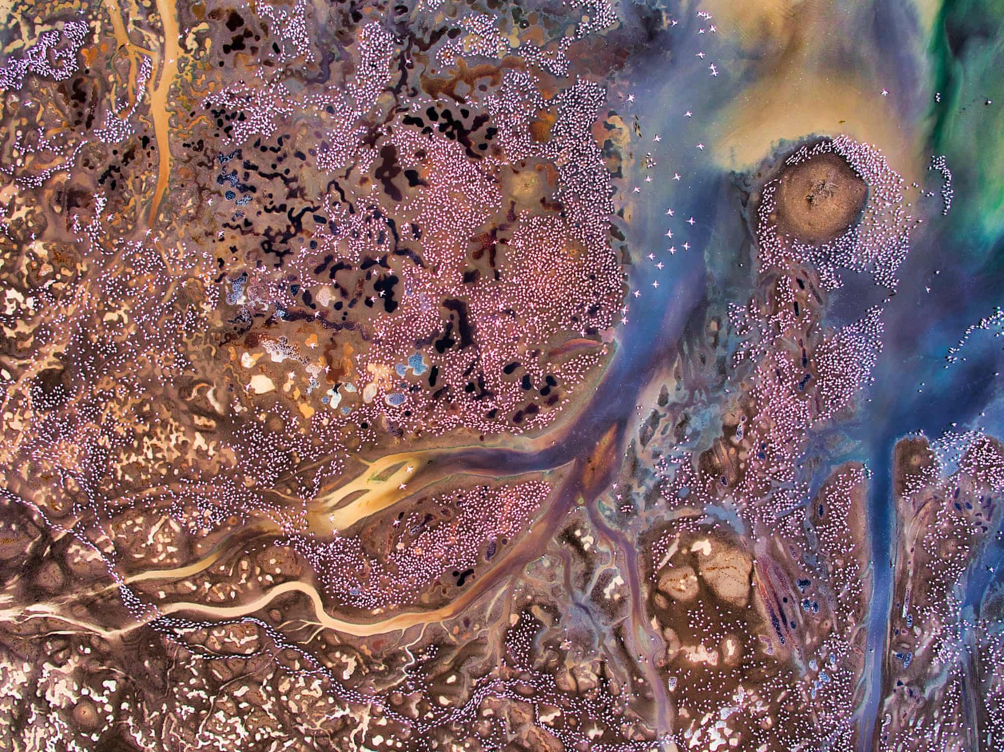 Победитель конкурса: испанский фотограф Кристобаль Серано снял на дрон стаю розовых фламинго. Птицы ищут в водах озера Богория в Кении цианобактерии, или зелено-голубые водоросли, которые являются для них основным источником корма. В результате засухи и высокой концентрации минералов и солей природа очертила такой необычный узор. Cristobal Serrano / 2018 GDT European Wildlife Photographer of the Year