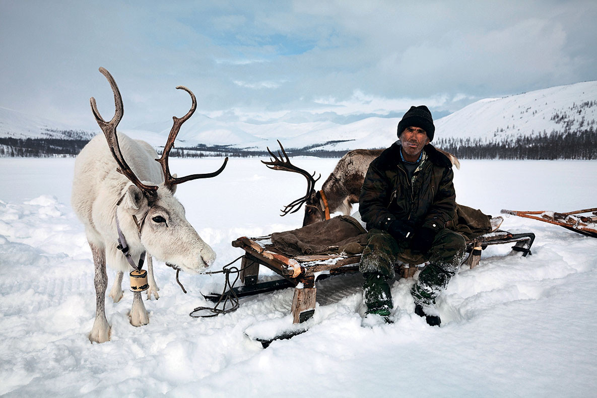 В Северобайкальске нас встретил наш давний друг Евгений Марьясов, который в 70-е годы приехал в эти края на строительство БАМа да так и остался здесь жить. Поездку к эвенкам-оленеводам организовал он. Для этого надо было проехать еще около 200 км до поселка Уоян. Дорога туда асфальтовая, ехали все еще на машине. В Уояне мы заночевали в гостинице, а наутро встретились с хозяином оленьей фермы Александром Плотниковым. Нашу машину мы оставили у него во дворе и уже все вместе сели на Сашину. Нам предстоял непростой путь по зимнику длиной примерно 150 км на север через Верхнеангарский хребет. К счастью, эта дорога худо-бедно поддерживается золотодобытчиками, поэтому, два-три раза откопав по пути автомобиль, к вечеру мы благополучно преодолели перевал. Но это было еще не все. Оставшуюся часть пути, около 15 км до фермы, мы проехали на снегоходе «Буран»: перегрузили на него наш скарб и с переменным успехом то пешком, то ходом добрались до места.