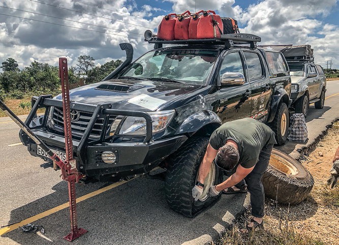 Машина завиляла из стороны в сторону, от одного края дороги до другого, но наш пилот ловил каждое неверное движение и компенсировал его поворотом руля. Выяснилось, что на полном ходу, на скорости около 100 км/ч разорвало переднее колесо. Ещё через пару минут мы шумно выдыхали на обочине трассы. Вроде всё закончилось хорошо. Со всех сторон уже бежали местные. Да, колёса, увы, иногда взрываются. Установить точную причину происшествия мы не смогли, да это было и не важно — нужно было ставить одну из запасок. Взорванное колесо годилось только на выброс, ремонтировать было нечего, так как ширина бокового разрыва превышала десять сантиметров. Слава богу, всё хорошо закончилось, ведь часто после взрыва колеса машина становится неуправляемой. Разумеется, ремонт превратился в небольшое шоу для африканской провинции. Белые путешественники ездят здесь нечасто. Но мы давно не воспринимаем это как нечто особенное, нас не напрягают три десятка зрителей, внимательно наблюдающих за каждым нашим действием, мы просто занимаемся своими делами. Африка давно перестала шокировать нас чрезмерным вниманием.