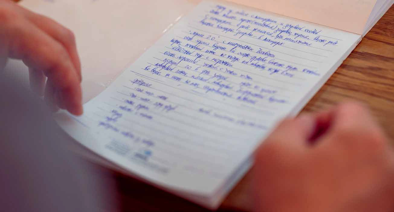 Хорошо, если десять — бывает и тридцать. Но чтобы составить представление о блюде, его нужно лишь попробовать. Затем, я достаю блокнот. Я человек старой школы и записываю впечатления (показывает свой блокнот). Вот, пожалуйста, вчера был в новом ресторане на Патриарших, продегустировал семнадцать блюд. Отметил основные мысли: солёный, грубый и т. д.