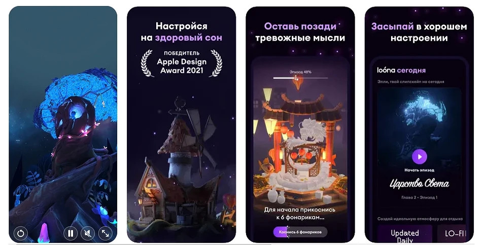 Loona — это приложение для расслабления перед сном. Но главный инструмент в нём не просто медитативная музыка, а так называемые слипскейпы. Это своего рода мини-истории (на русском языке), в которых надо следить за сюжетом и выполнять простые задания на дыхание или внимание. Темы историй самые разные: от японского сада, до мистического портала. Графика и анимация — отличные, на фоне историй играет спокойная музыка.