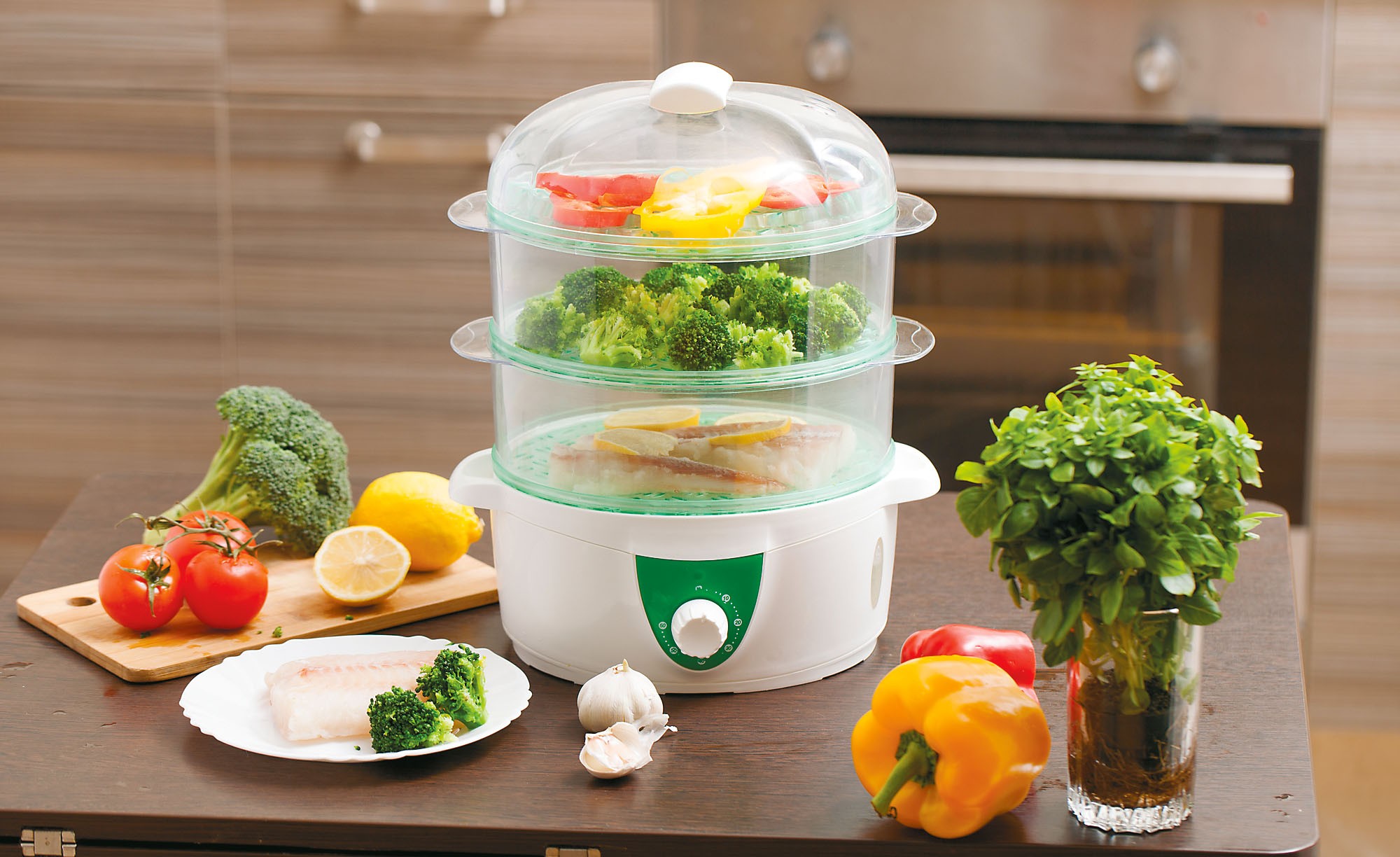 • В пароварке не используются никакие масла, а излишки жира из мяса или рыбы вытекают из продукта. Поэтому любое блюдо получается диетическим и с низкой калорийностью.