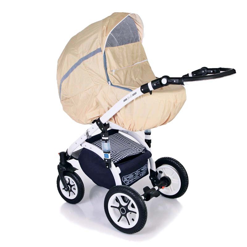 Хорошую проходимость и мягкий плавный ход коляски обеспечат большие надувные колеса с усиленным протектором и система амортизаторов. Если коляска между прогулками паркуется дома, полезным приобретением станет комплект защитных чехлов для колес, чтобы пол оставался чистым, без уличной грязи.
