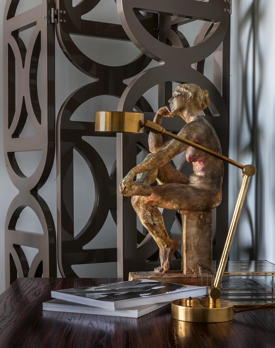 Во многих историях окна или вид из них задают тон интерьеру. В этом проекте с ними тоже пришлось считаться. К примеру, их конструкция и обрамление стали причиной появления элементов в стиле ар‑деко, несмотря на то что жилье находится в стеклянной новостройке. Они же повлияли на планировку: “Ширина квартиры от одного стеклянного фасада до другого — восемнадцать метров. Чтобы было достаточно дневного света, глубина комнаты не должна превышать шести метров, поэтому получалось, что в центре квартиры оставались шесть метров темноты”, — говорит Ольга, автор проекта, дизайнер и член АДДИ. Это темное место заняла прихожая со старинным каминным порталом XVIII века. Справа расположилась общественная зона, а слева — гардеробные, детские и хозяйская спальня.