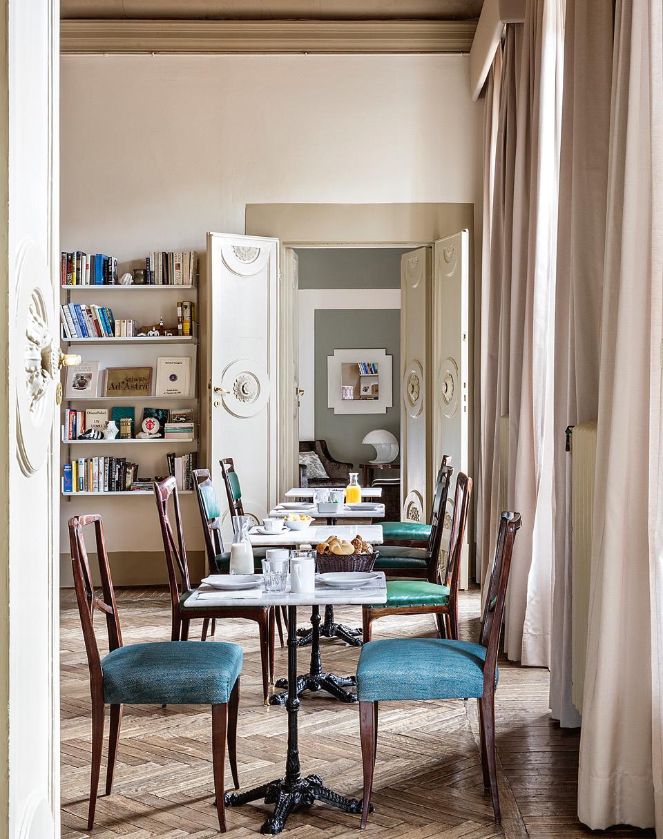 Роскошный семейный пансион располагается в палаццо, которое с XV века принадлежало семейству богатых флорентийских торговцев Торриджани — хозяева и сейчас занимают верхние этажи здания. Над интерьерами AdAstra работали архитектор Франческо Маэстрелли и братья-дизайнеры Марко и Маттео Пердука. Пространство получилось очень живым, как будто это и не гостиница вовсе, а настоящий дом. Помпезная архитектурная оболочка служит фоном для разноцветной мебели — в основном это винтаж 1940–1960‑х годов. На полках стоят книги, стены комнат плотно увешаны всевозможными картинками, везде море аксессуаров. В каждом номере имеется отдельно стоящая ванна, и это единственное, что их объединяет, — интерьеры в каждой комнате разные. В коридорах авторы проекта позволили себе отойти от образа эклектичного итальянского жилища и добавили немного “американщины”: на черных стенах развешаны обложки журналов The New Yorker. Но в остальном здесь все очень чинно.