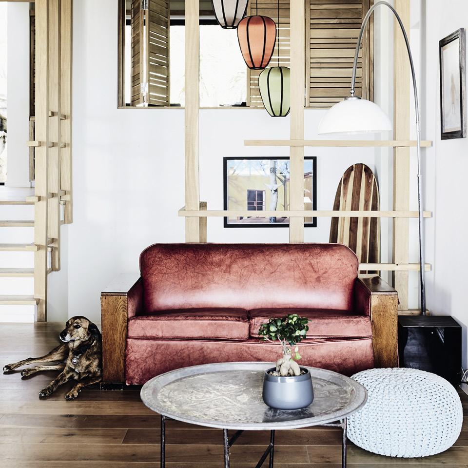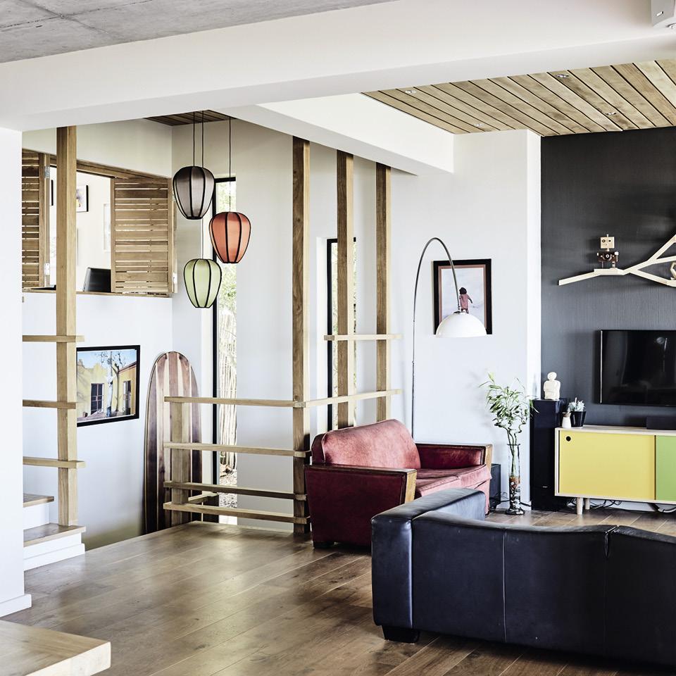 Дом находится недалеко от побережья, а хозяева, которые самостоятельно занимались его оформлением, — большие любители здорового образа жизни на свежем воздухе (не зря в углу притаилась серферская доска). Интерьер у них получился с элементами экостиля, но без фанатизма. С реечным потолком и простыми деревянными ограждениями соседствует винтажный диван богемного вида, а одна из стен покрыта краской цвета антрацит. Подобная контрастная покраска (см. на предыдущем развороте) позволяет создать в комнате зрительный центр, а при необходимости — визуально откорректировать пропорции помещения.