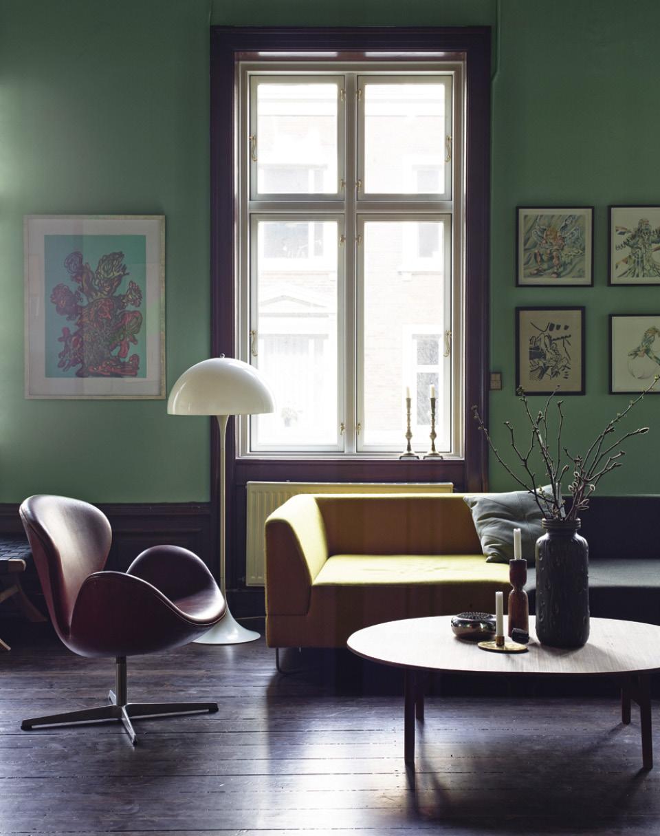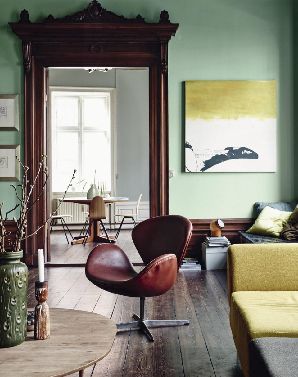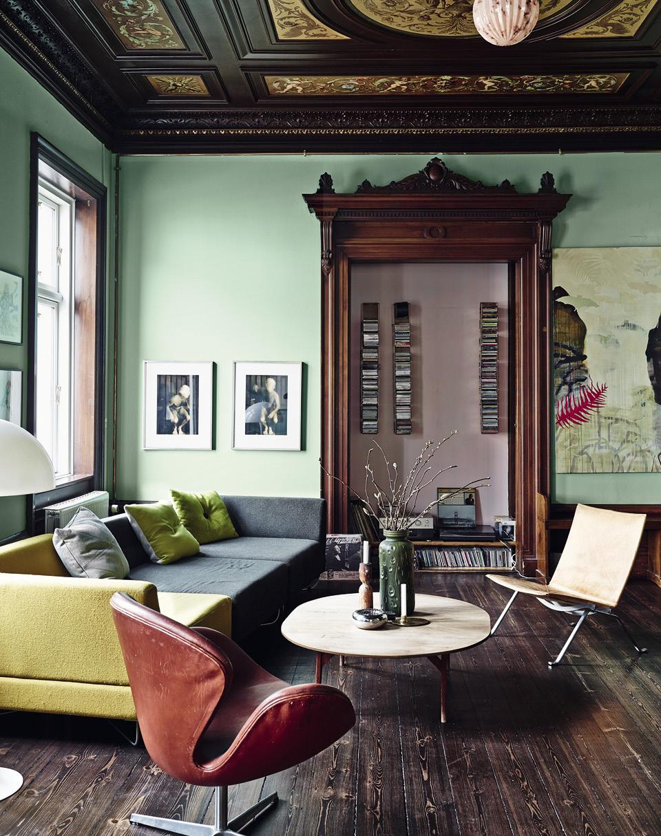 По этому интерьеру видно, как сильно изменились вкусы датчан за последние сто двадцать лет. Квартира в доме 1890 года с оригинальными дверными порталами из темного дерева и расписными потолками принадлежит модельеру Дитте Лампти и ее семье. Хозяева заполнили ее классикой дизайна, без которой редко обходятся современные скандинавские интерьеры, — от светильников Луи Полсена до кресел Арне Якобсена. А вот от белой краски, столь любимой ее соотечественниками, Лампти решила отказаться. Вместо этого она в буквальном смысле слова брала цвета для стен с потолка.