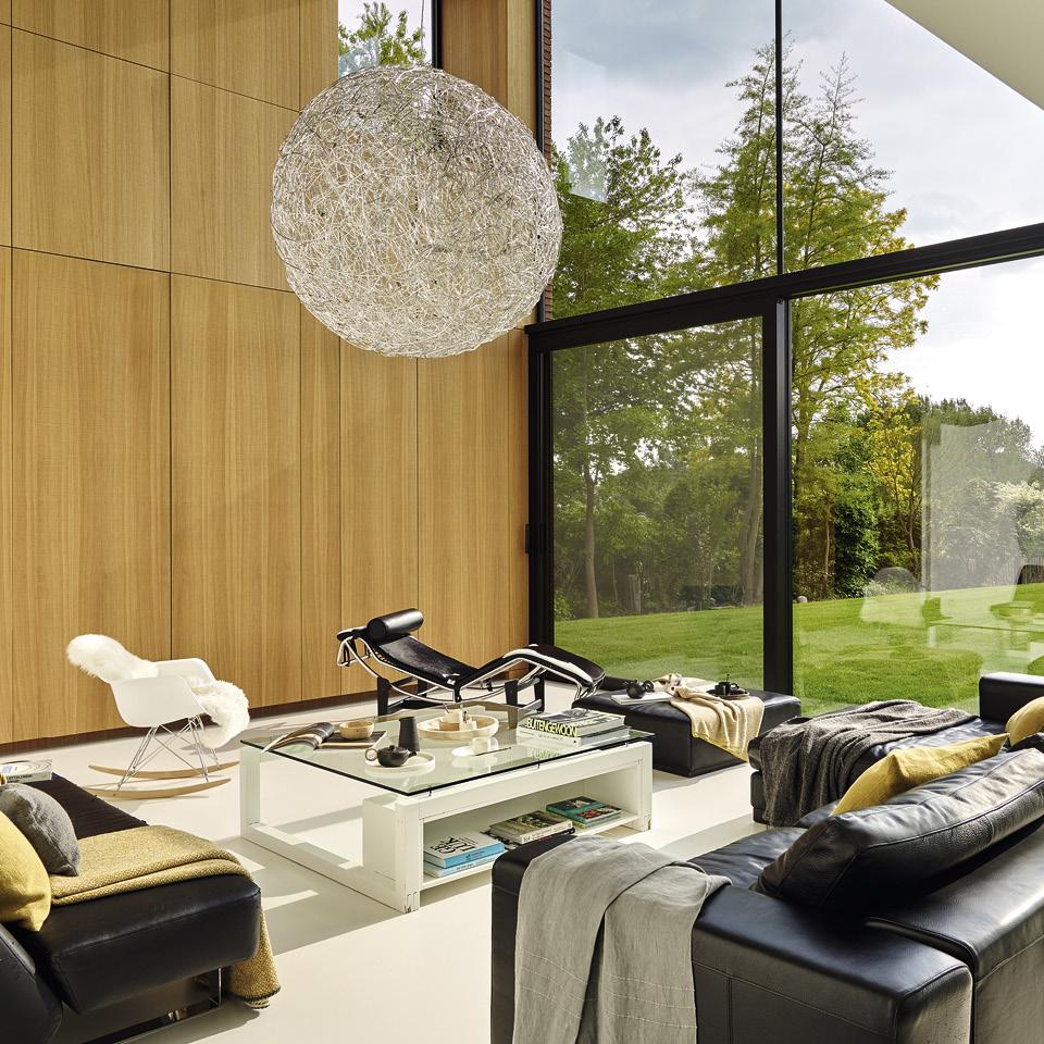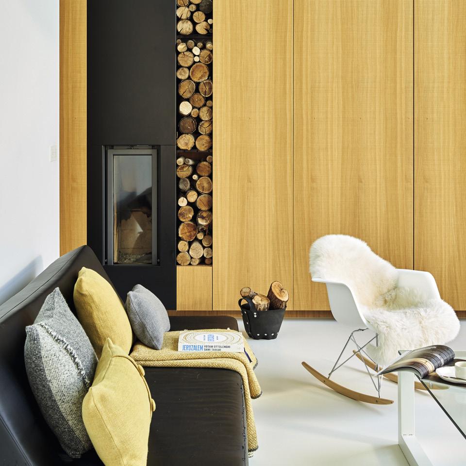 Двусветная гостиная с окнами во всю стену — это классика современной архитектуры. Для того чтобы такое пространство не выглядело слишком холодно, в отделке часто используют натуральные материалы — камень или, как в этом случае, дерево. Кстати, подобные стеновые панели хороши тем, что за ними могут скрываться и вместительные шкафы, и коммуникации. Камины тоже помогают согреть пространство — не только физически, но и визуально. Здесь очаг небольшой, но его присутствие легко заметно благодаря живописной поленнице.