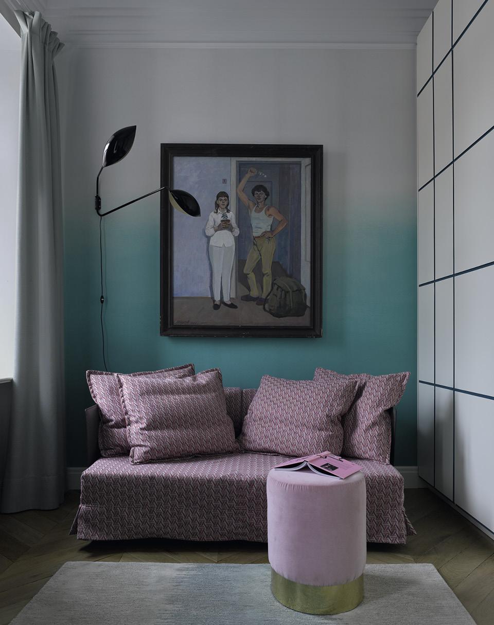 В мос­ков­ской квар­ти­ре, оформ­лен­ной “Арт‑бюро 1/1”, от­тен­ки тек­сти­ля под­би­ра­лись так, что­бы со­зда­ва­лось ощу­ще­ние, буд­то за ок­на­ми все­гда рас­свет или закат.