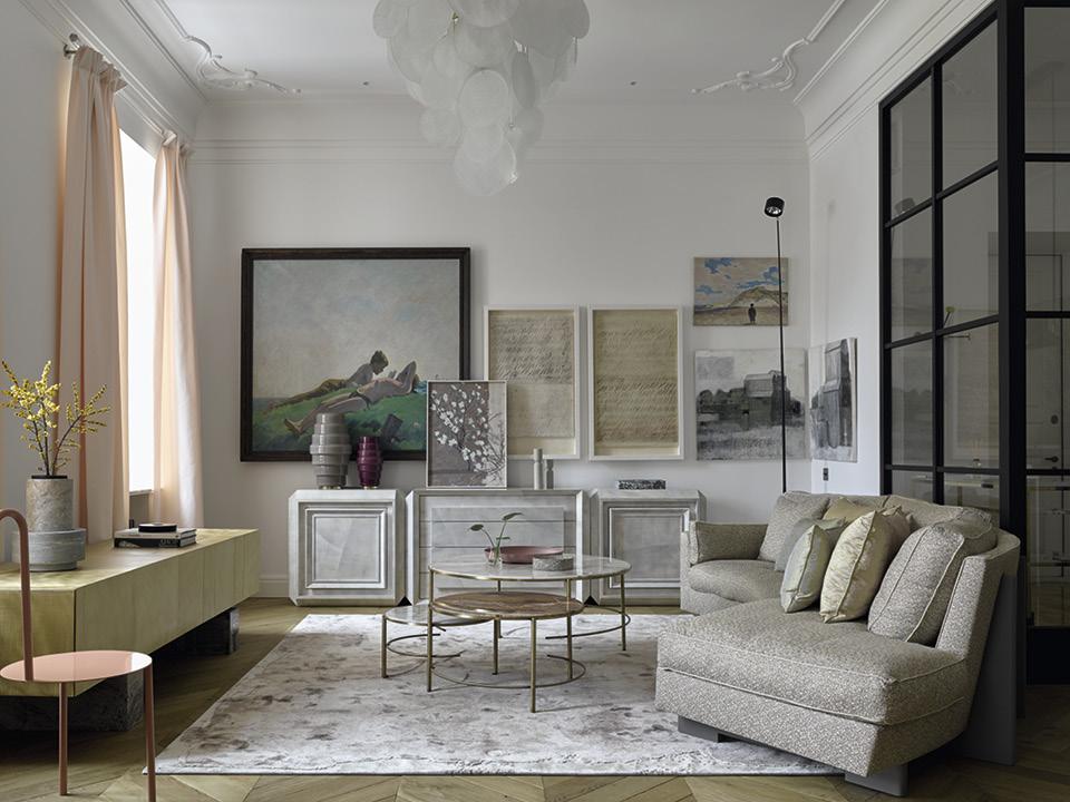 Зона го­сти­ной. Консоль, Henge. Стул, Crosby Studios. Журналь­ные сто­ли­ки по ди­зай­ну “Арт‑бюро 1/1”. Люстра, CTO Lighting. Лампы на ко­мо­де, Venini. Вазы, Michaël Verheyden. Текстиль, Lelievre. Торшер, Davide Groppi. Диван, Mobilidea. Перего­род­ка из стек­ла по ди­зай­ну арт‑бюро. На сте­не кар­ти­ны Якова Козло­ва, Натальи Заров­ной и Екате­ри­ны Рожко­вой. Ковер, шелк, Rug Star, из Dovlet House.