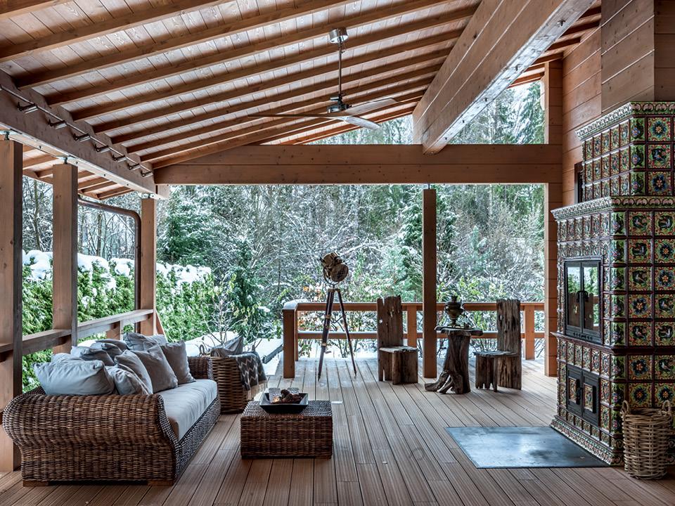 Терра­са. Улич­ная ме­бель, Gervasoni. Подвес­ной све­тиль­ник, Boffi. Печь сде­ла­на на за­каз ком­па­ни­ей “Израз­цо­вые печи”. Ограж­де­ние тер­ра­сы — по эс­ки­зам Юлии Дени­со­вой. Подсвет­ка дома тоже про­ду­ма­на архитектором.