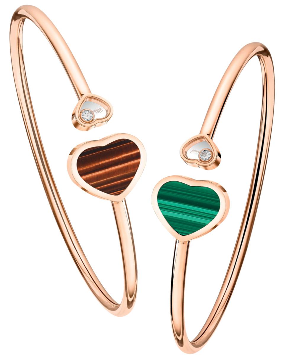 Компания Chopard пополнила коллекцию Happy Diamonds новыми браслетами. Они сделаны из золота с малахитом или тигровым глазом, а внутри прозрачных сердечек находятся фирменные “танцующие” бриллианты.