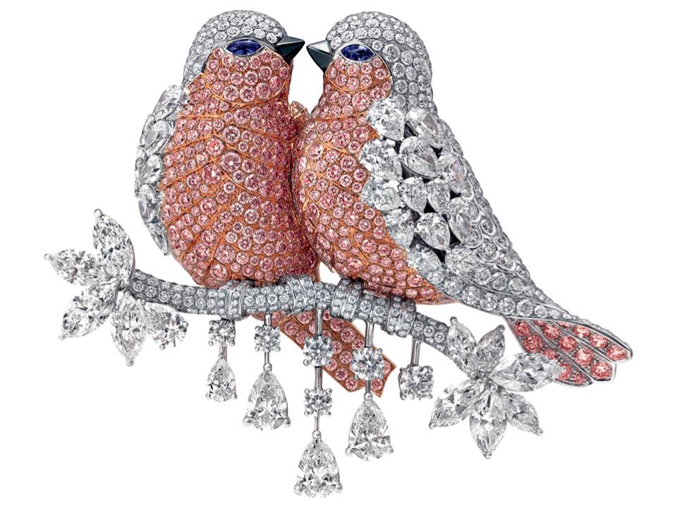 Птички на брошке Lovebirds из новой коллекции Graff выглядят почти как живые. Только вместо оперения у них обычные и розовые бриллианты и оникс, а глазки сделаны из сапфиров.