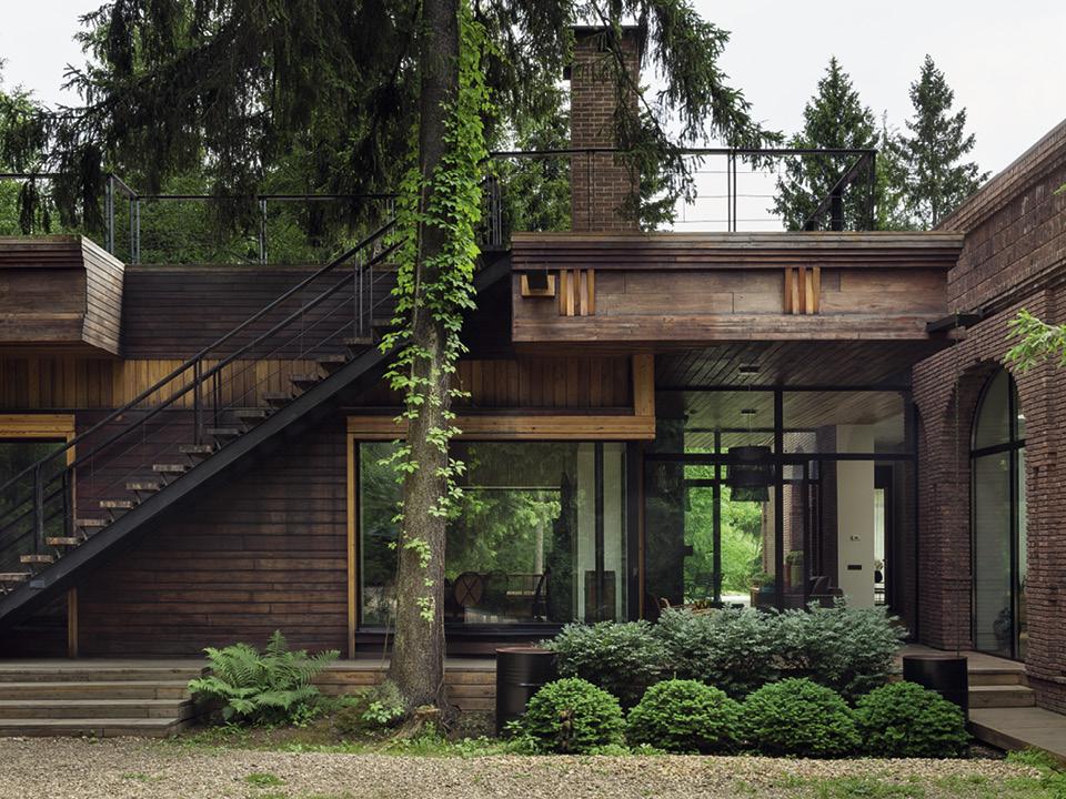 Комплекс проектировал друг Константина — архитектор Дмитрий Долгой. Он придумал общую концепцию дома, тщательно продумал, куда ему “расти” впоследствии, и осуществлял общее творческое руководство стройкой на всех ее этапах, хоть и не занимался сам детальной технической разработкой проекта — это делала архитектор Вера Ефимова. Дом состоит из двух частей. Вместе они напоминают букву Т. Такая форма обусловлена природным ландшафтом — на участке много деревьев, которые не хотелось срубать. Ради сохранности деревьев дом сделали конструктивно сложным: он стоит на столбчатом фундаменте, чтобы не повредить экосистему участка. Разработкой занимался талантливый конструктор Дмитрий Огарев. В итоге благодаря и его усилиям тоже ни одно дерево на участке не пострадало.