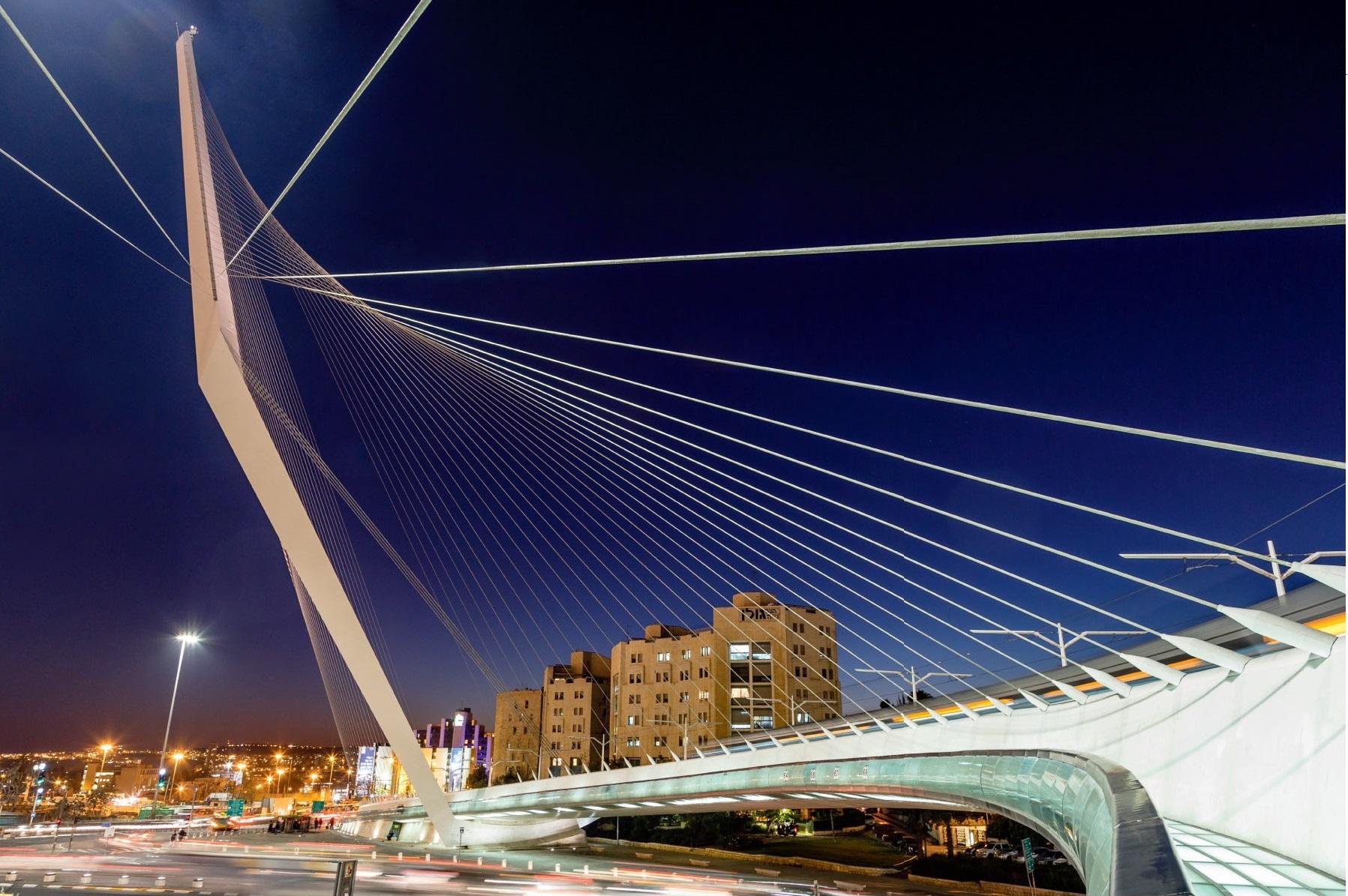 Реки в Иерусалиме, как известно, нет. А вот работа главного мостостроителя современности Сантьяго Калатравы все-таки есть. “Струнный мост”, открытый в 2008 году, служит путепроводом для линии скоростного трамвая, а пешеходам он позволяет с комфортом пройти над оживленной транспортной развязкой к центральному автовокзалу. Траты на строительство ($70 млн, вдвое больше первоначального бюджета) восторга у общественности не вызвали, но популярной достопримечательностью мост стал сразу и без особой связи с транспортными удобствами. 118-метровая бетонная мачта, к которой крепятся удерживающие мост ванты, — эффектный объект, отмечающий главный въезд в Иерусалим со стороны Тель-Авива. Это сороковой мост в карьере Калатравы, принципиальных инженерных новаций здесь в общем-то нет, и все же местные жители полюбили постройку за дополнительный символизм, который им видится в натянутых, словно струны, вантах: мост поэтично называют также “Давидовой арфой”.