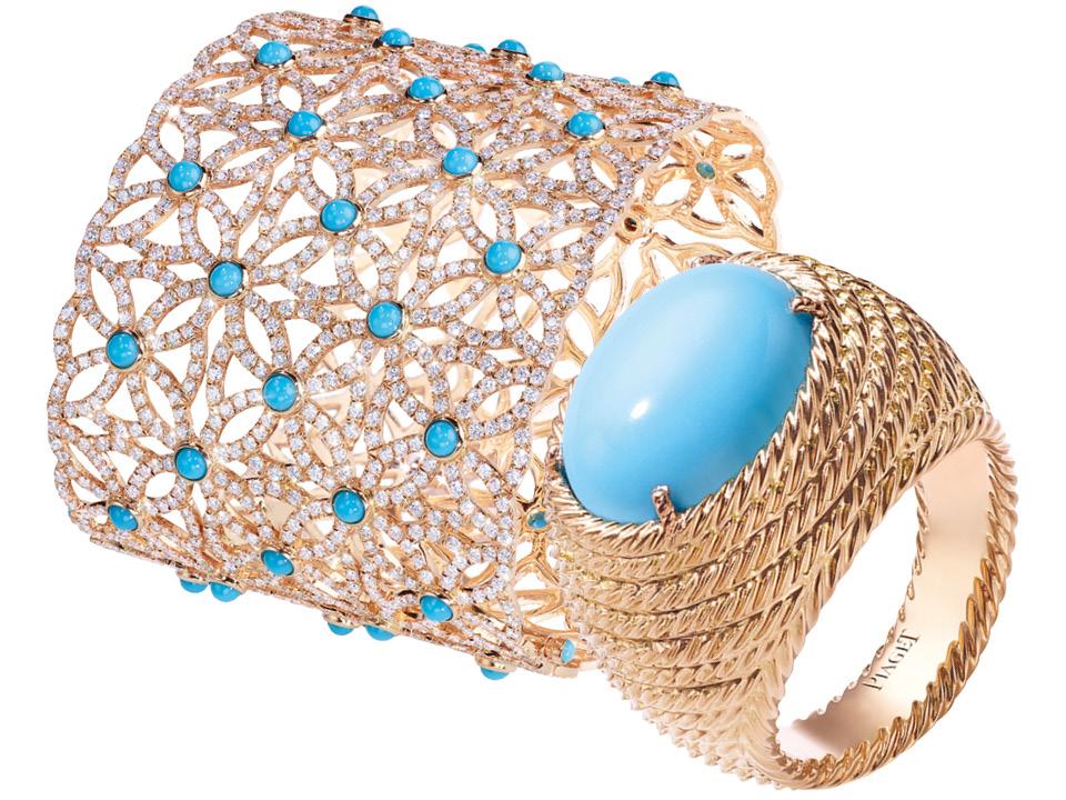 В капсульной коллекции Extremely Piaget золото имитирует текстиль. Браслет с бриллиантами, бирюзой и хризоколлой похож на кружево, а кольцо словно свито из толстых ниток.