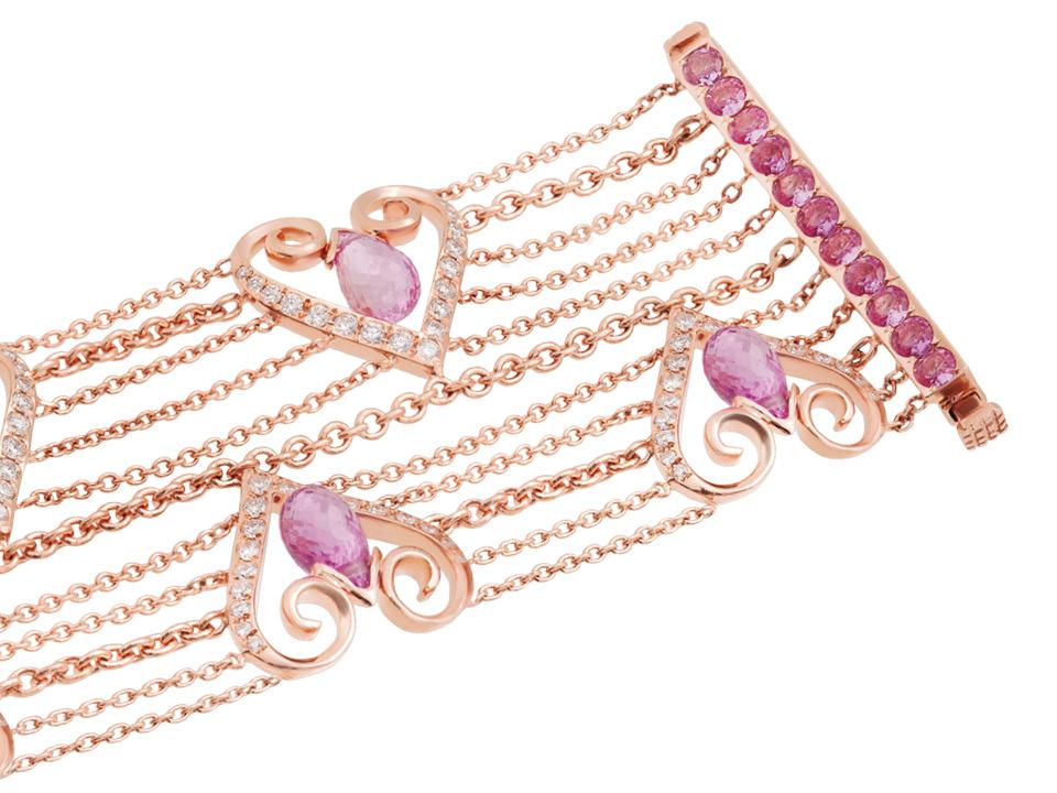 Балет “Шехеразада” вдохновил дизайнеров русской ювелирной марки Gourji на создание одноименной коллекции. Ее лейтмотив — сердце из двух завитков — взят с эскизов Льва Бакста. На фото браслет из розового золота, розовых сапфиров и бриллиантов.