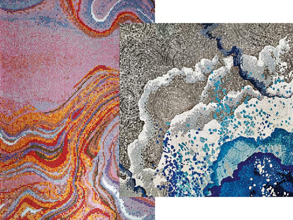Драгоценные камни, перламутр и даже мех — не только мозаика, но и все эти материалы вполне могут оказаться частью художественных панно Sicis. Внизу две новинки из коллекции Art Couture — Hekla и Alchymia Aqua.