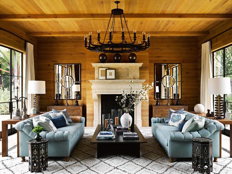 Дизайнеры часто “гасят” желтизну деревянных стен тонировкой. Дизайнер Мартин Лоренс-Буллард сделал иначе: поставил посреди обшитой деревом гостиной пару огромных голубых диванов. Они здесь — как глоток свежего воздуха. Не обошлось и без любимых Буллардом марокканских столиков.