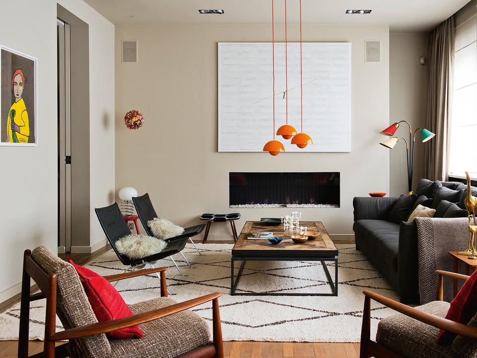 Хозяйка дома любит стиль середины ХХ века и с помощью архитектора Алена Делоне довольно точно воспроизвела его у себя в гостиной. Низкую мебель дополняет такой же низкий камин, а светильники явно тянутся к полу — эта приземленность дает ощущение расслабленности и зрительно приподнимает потолок.