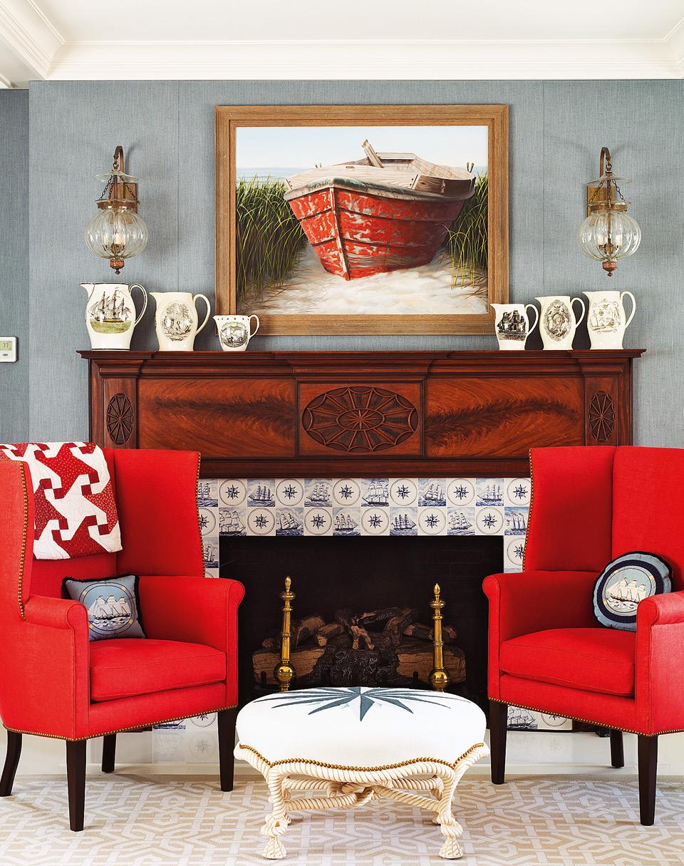 В этом проекте Энтони Баратты красной нитью проходит морская тема. Даже на плитке вокруг топки изображены парусники и роза ветров. А в остальном это идеально организованная каминная группа, можно смело брать на вооружение.