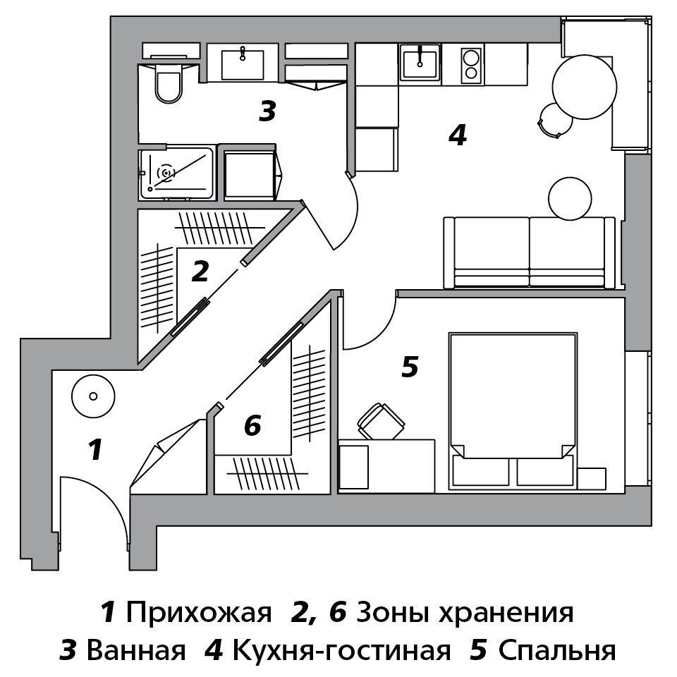 В основе планировки этой квартиры лежат принципы восточной головоломки танграм, для решения которой нужно сложить определенную геометрическую фигуру из разрозненных частей. Татьяна с нуля “собрала” квадрат из прямоугольных спальни, кухни-гостиной и ванной с зоной постирочной, коридора в форме параллелограмма и трех треугольных зон хранения
