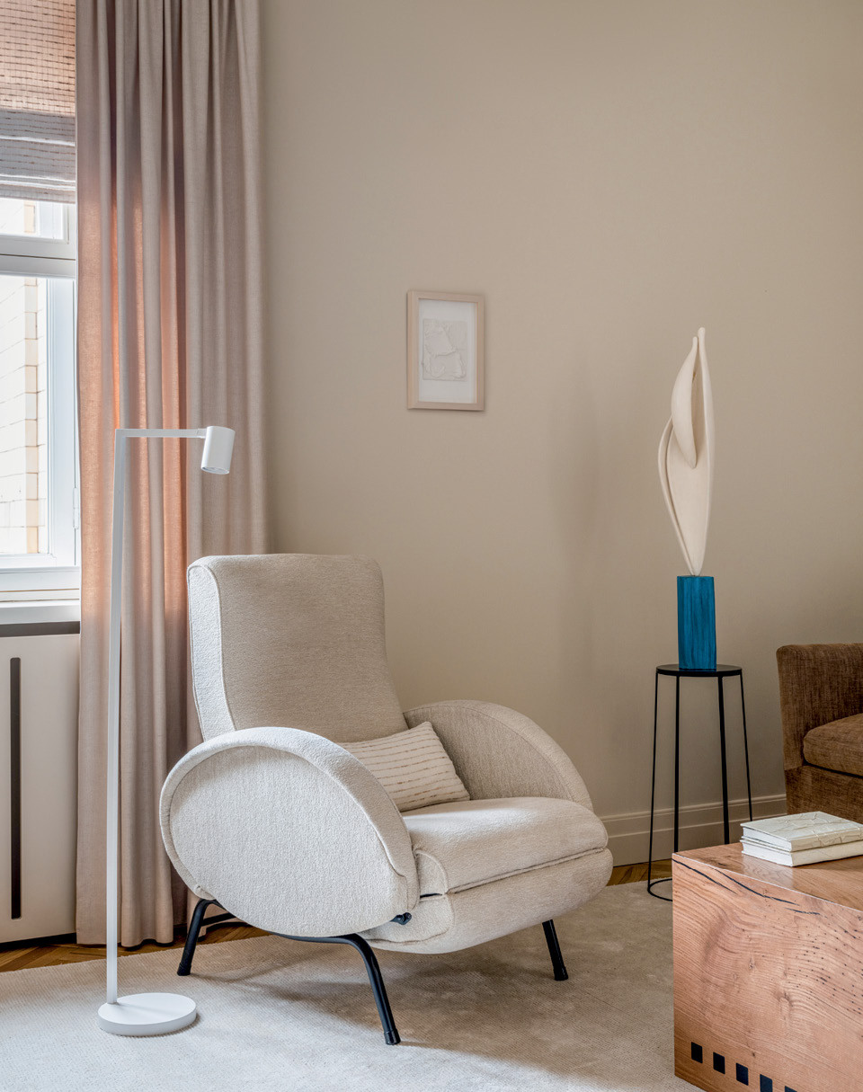 Двухкомнатную сталинку на Фрунзенской набережной взрослые дети купили для своей мамы, чтобы она могла как можно чаще видеть шестерых внуков, но при этом имела возможность отдохнуть от них. “Естественно, была задача сделать максимальное количество мест хранения”, — рассказывает Снежана Цуцаева. Хозяйка квартиры — большая модница, у нее солидный гардероб, поэтому предполагалось много встроенных шкафов, которые нужно было разместить так, чтобы не сделать небольшую квартиру тесной.