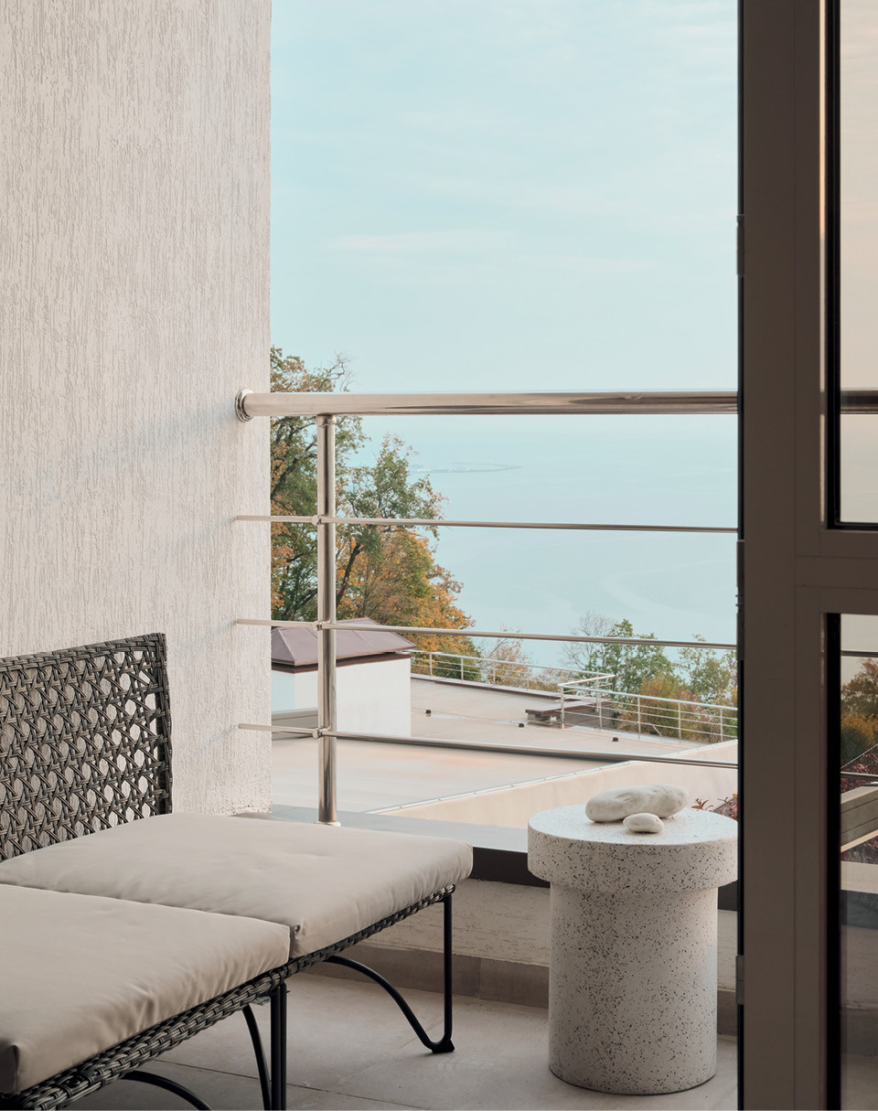 Изначально квартира представляла собой вытянутую бетонную коробку с двумя окнами и лоджией по одной стене, поэтому с освещенной стороны дизайнер разместила гостиную со столовой и спальню, в кухню дневной свет немного проникает, а в гардеробной и ванной он только искусственный. “В курортном городе гораздо важнее гостиная и столовая, чтобы люди могли общаться, обедать и смотреть на море, поэтому примерно половину площади я выделила именно под общую зону”, — говорит Анастасия. В гостиной кроме дивана есть кушетка, которая стоит у окна: если ее развернуть, то можно читать или размышлять, глядя на море. А при необходимости и диван, и кушетка превращаются в полноценные спальные места.