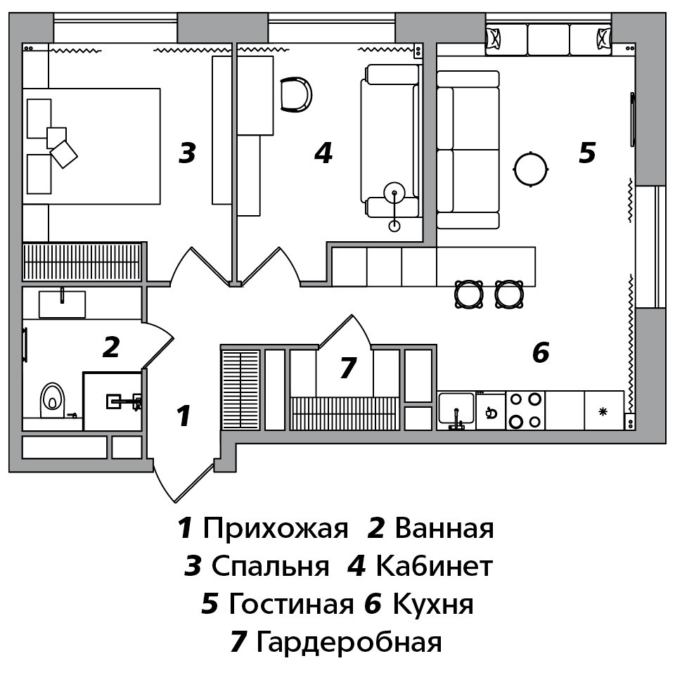 Квартира с удобной изначальной планировкой: две комнаты, большая кухня-гостиная, санузел и гардеробная, поэтому ее не стали существенно менять, тем более что кухню-гостиную отделяла несущая стена. Одна из комнат стала изолированным кабинетом с функцией гостевой спальни и, как показал наступивший вскоре после окончания ремонта карантин, это оказалось самым верным решением. Единственные корректировки, которые внес архитектор: сместил дверной проем в ванной, чтобы поставить там душевую