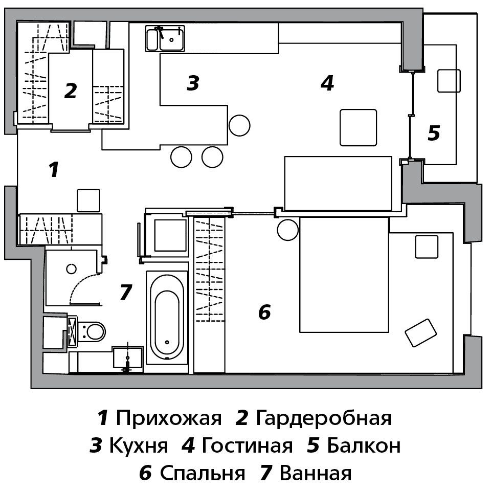 “Когда квартира маленькая, есть смысл проектировать ее как единую конструкцию, — объясняет Елизавета. — То есть не строить лишние стены, а делать так, чтобы мебель выполняла их функцию”. Второй принцип, которого придерживаются дизайнеры BIGO в работе с маленькими квартирами, — места для хранения много не бывает. В этой квартире есть гардеробная при входе, напротив нее — шкаф, который переходит в кладовую; есть место для хранения хозяйственных мелочей в постирочной и гардероб в спальне. Плюс композиция шкафов разного назначения в кухне-гостиной. “Хотелось максимально все убрать, — говорит Елизавета, — чтобы вещи не мешали, не были на виду, поэтому мы продумывали все до мелочей: где будет стоять обычный пылесос, где робот-пылесос и где — увлажнитель воздуха. Мы пытались представить себе жизнь нашей заказчицы в этой квартире и предусмотреть все возможные ситуации”.