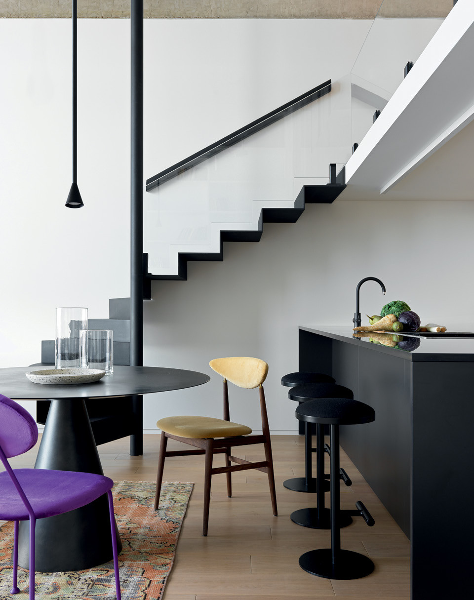 Внешняя стена квартиры полностью стеклянная, но это единственное окно, так что поделить пространство на две комнаты невозможно: либо одно из помещений останется без естественного света, либо придется дробить остекление перегородкой. “Это частая проблема апартаментов в индустриальных зданиях”, — отмечает архитектор. Альтернатива — спальня на антресолях: “Высота потолков — 4,06 м, сложная, но возможная для создания второго уровня”. Главное — рассчитать толщину перекрытий так, чтобы они были как можно тоньше и не в ущерб надежности (весь “пирог” с учетом отделки получился 12 см). Высота нижнего этажа — 197, верхнего — 188 см. Потолок остался бетонным,