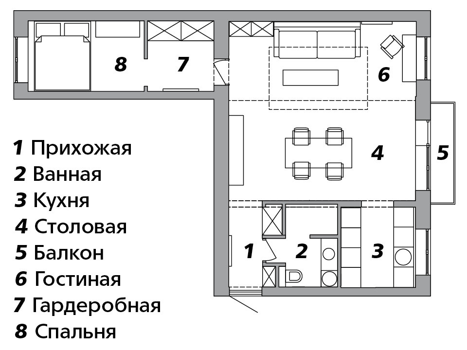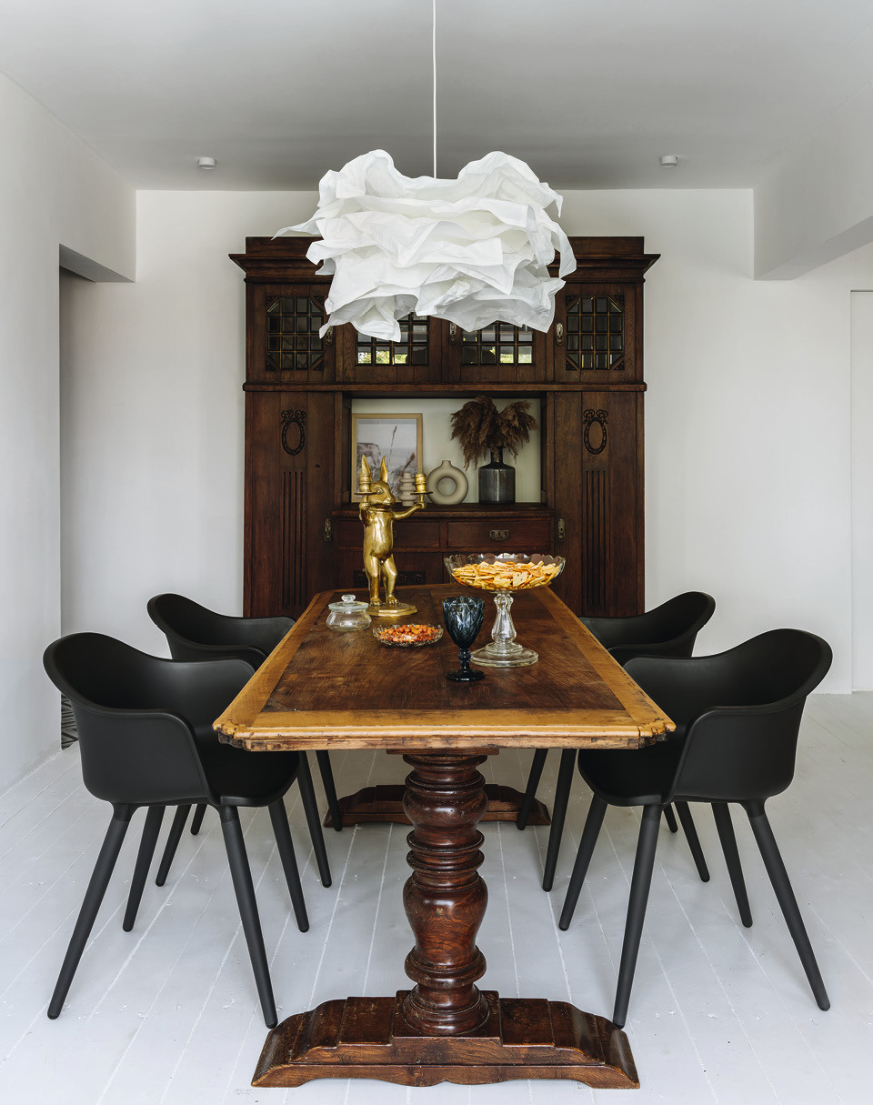 Интерьер, как говорят авторы, сложился сам собой. Расчистили полы — открылись чудесные доски, оставалось лишь отшлифовать их и покрасить. После того как пол и стены стали белыми, появилась мысль перетащить в квартиру дух загородного дома. С проданной дачи в квартиру переехал старинный буфет, купленный лет десять назад, к нему добавился массивный стол из цельного ореха, тоже антикварный. Эти слишком крупные для хрущевки предметы сбивают масштаб: глаз невольно цепляется за них и уже не пытается оценить ни размеры комнаты, ни высоту потолка, который здесь, как и положено, 2,50 м. С другой стороны, мебели