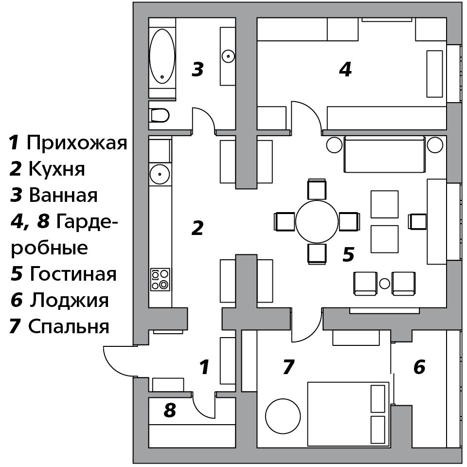 Семья Анастасии Комаровой прожила в этой квартире больше двадцати лет, а с этого года жилье сдается в аренду. Перепланировка, которую мы видим, была сделана еще в середине 1990‑х. “Мы переехали из коммуналки, и мама хотела, чтобы у нас с сестрой была своя детская, поэтому превратила двушку в полноценную трешку”, — рассказывает дизайнер. Кухню перенесли в коридор, а ее место заняла родительская спальня. После того как сестра Анастасии вышла замуж, а мама переехала за город, она сделала из этого пространства творческий полигон. “Цветовая гамма квартиры менялась вслед за моим настроением: когда-то она была белой, потом появились коричневые и темно-зеленые оттенки, сейчас все серое”, — рассказывает хозяйка.