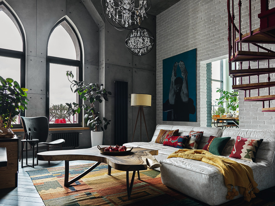 Здесь сразу два важных акцента — огромные окна и необычная лестница, соединяющая этажи. “Заказчики очень любят путешествовать, поэтому мы решили отразить их страсть в интерьере и сделали винтовую лестницу с балконом в форме пролета моста Золотые Ворота в Сан-Франциско”, — рассказывают дизайнеры. Наверху получился “родительский блок” со