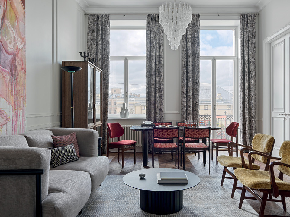 Квартира находится в доходном доме на набережной реки Фонтанки, с видом на Большой Санкт-Петербургский цирк. Заказчики Анастасии Хальчицкой купили ее в качестве второго жилья, чтобы оставаться в центре города на выходные и проводить там время с друзьями, и это повлияло на планировку и наполнение квартиры: например, хозяевам не нужна была большая кухня и полноценная гардеробная, зато требовалась просторная общая зона гостиной и столовой.