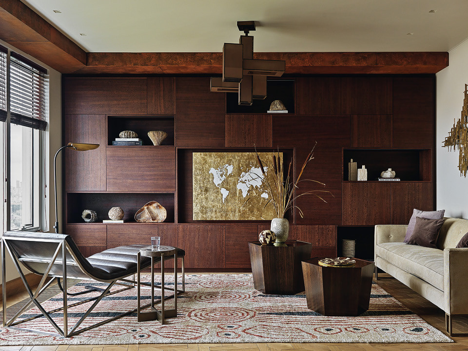 Геометрия квартиры сложная, с большим количеством углов и комнатой, вынесенной по диагонали по отношению к остальным помещениям, зато без несущих стен внутри, что и позволило сделать желаемую планировку. Чтобы немного сгладить впечатление от “неровной” комнаты, Лидия добавила отделку, светильники и искусство с прямоугольными деталями. Получилось строго, но при этом очень уютно.