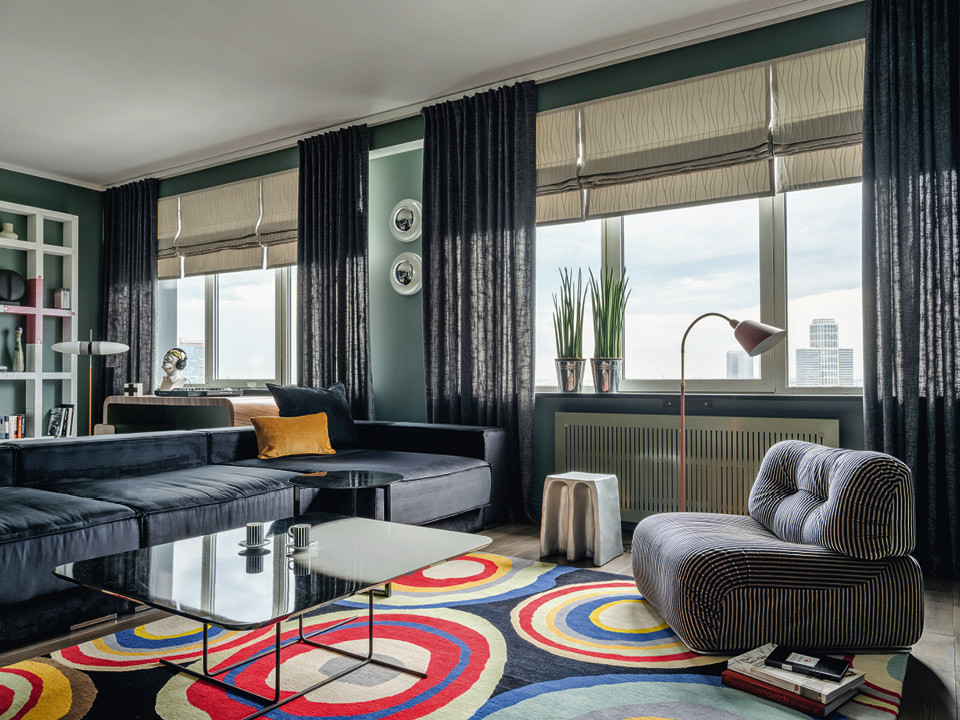 Цветовую гамму Екатерина выбрала в соответствии с теми оттенками, которые ее сын предпочитает в одежде, — это серый, черный, кремовый и все оттенки зеленого. Последний к тому же обладает умиротворяющим воздействием на Александра, что особенно важно после ночей в клубах. “В ограниченном пространстве я предпочитаю использовать глубокие, темные оттенки, они визуально размывают границы, — делится дизайнер. — Еще один прием — это масштабные картины или арт-объекты, которые прекрасно работают в противовес маленькой площади”. В гостиной она повесила внушительного размера работу Дмитрия