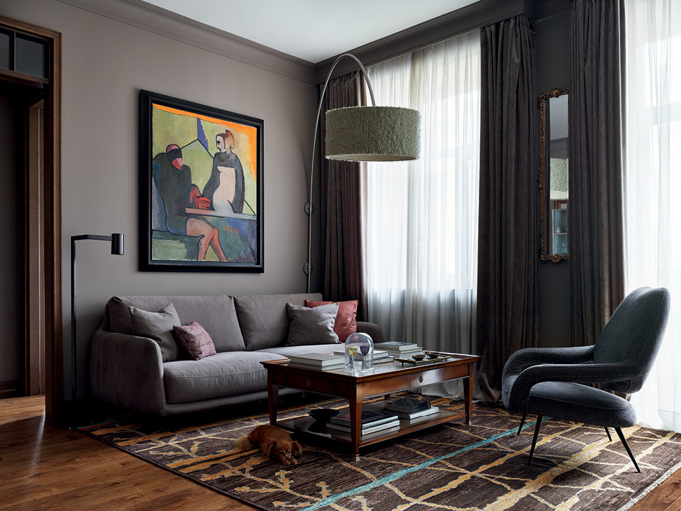 Заказчица Антонины Белинской купила квартиру в доме 1935 года на Хитровке и сначала думала, что ей нужен современный интерьер. Но дизайнер убеждена, что район, дом и вид из окна диктуют определенные правила, и предложила оформить квартиру в духе старой Москвы. Заказчица согласилась и попросила сделать уютный, обволакивающий интерьер, в котором можно будет “спрятаться, как в норе”. Чтобы добиться такого эффекта, Антонина выбрала глубокие насыщенные оттенки — кофейный, темно-синий и серый.