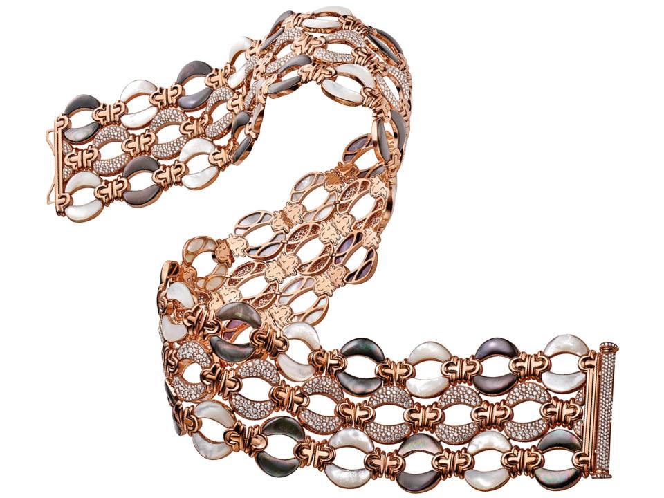 Древнерим­ские до­спе­хи вдох­но­ви­ли ди­зай­не­ров мар­ки Bvlgari на со­зда­ние ко­лье Parentesi Hamata из ро­зо­во­го зо­ло­та, пер­ла­мут­ра и бриллиантов.