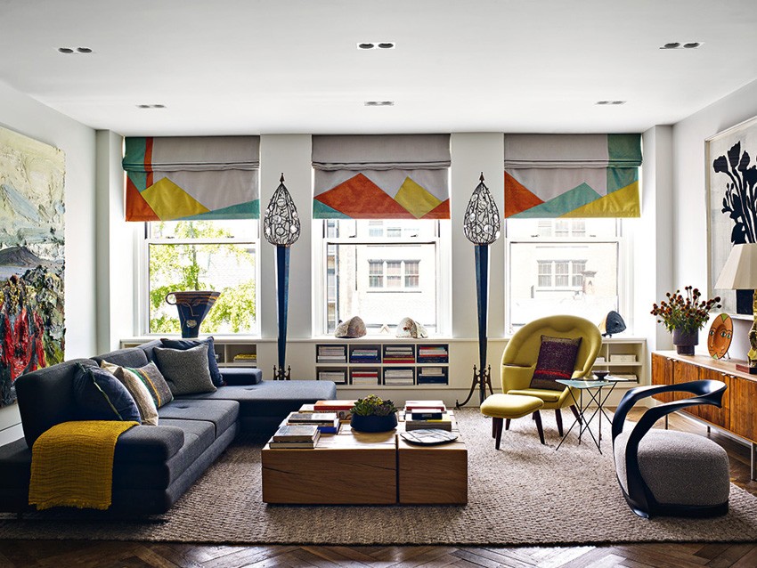 Гостиная. Римские шторы из металлизированного льна сшиты на заказ и образуют абстрактную композицию-триптих. На подоконнике керамический кувшин работы Брюса Маклина и керамические скульптуры Эрика Астула. В простенке между окнами бронзовые торшеры со стеклянными фонарями по дизайну Марка Брейзир-Джонса, Maison Gerard. Журнальный столик из деревянных брусьев сделан на заказ; стул с фигурным деревянным каркасом по дизайну Кэрол Иган; желтое кресло по дизайну Нанны Дитцель.