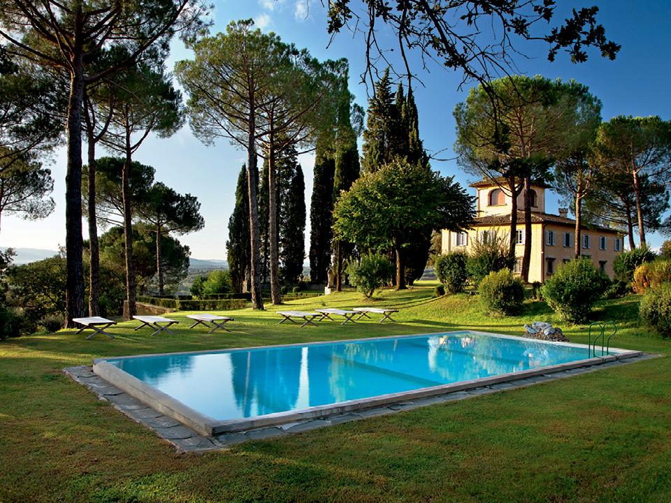 Вид на вил­лу со сто­ро­ны бас­сей­на. Само зда­ние да­ти­ру­ет­ся XVI ве­ком, а вот бас­сейн сде­ла­ли лишь в XX веке.