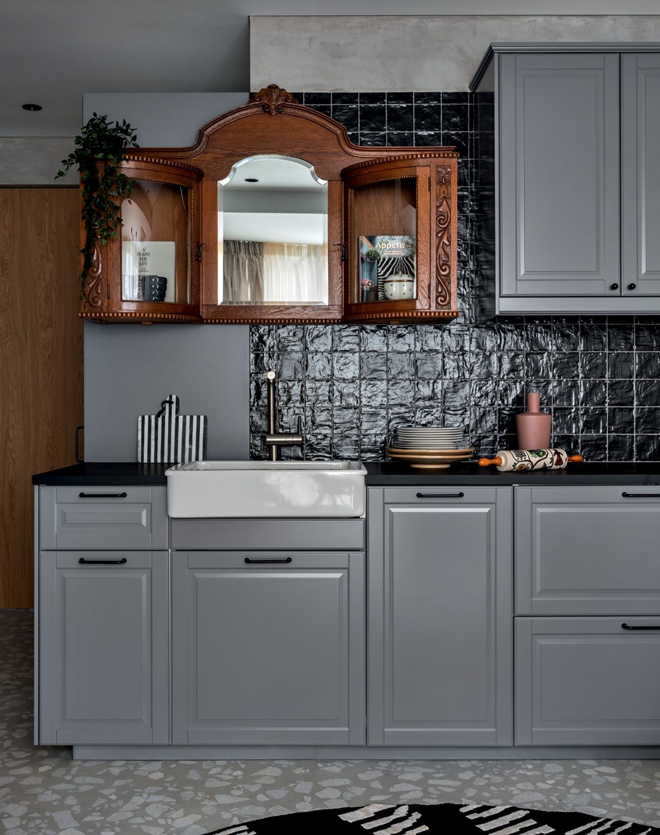 По задумке дизайнера основная часть интерьера монохромная, цвет появляется только в спальнях, а вот ванная комната выдержана в темных оттенках. Обстановка эклектичная, на европейский манер: типовая мебель сочетается с находками с блошиных рынков. Например, резной подвесной шкафчик добавляет душевности кухне. Кстати, он закреплен так, что заходит на торец холодильника, частично маскируя его. Все светильники дизайнер заказывала в Европе у производителей — так, по ее словам, вышло дешевле. “Когда надо вписаться в бюджет, можно купить недорогой кухонный гарнитур, но не стоит экономить на напольных покрытиях и сантехнике. Если случится поломка или протечка, их устранение будет стоить дороже”, — уверена Анастасия.