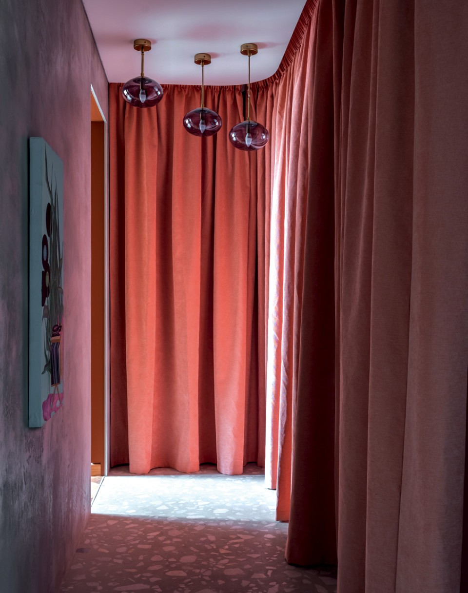 Систему хранения она вынесла в коридор и закрыла полки портьерами лососевого оттенка. “Хорошая гардеробная с дверьми — это приличное вложение, а нам надо было вписаться в бюджет”, — говорит Анастасия. Так вместо панелей появился текстиль. В тех местах, где нет полок и необходимости отодвигать штору, ткань зафиксирована таким образом, чтобы не нарушалась драпировка.
