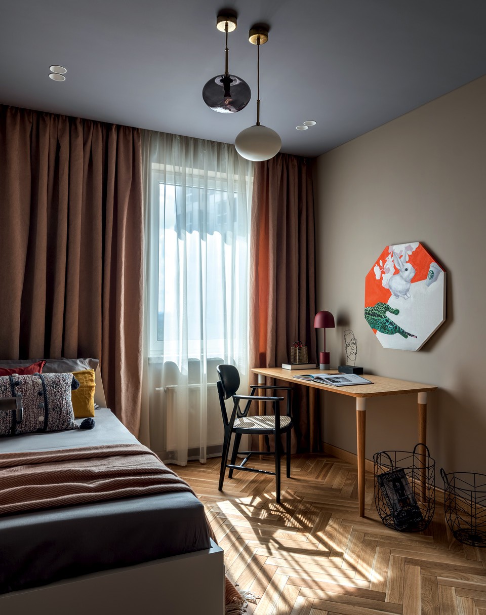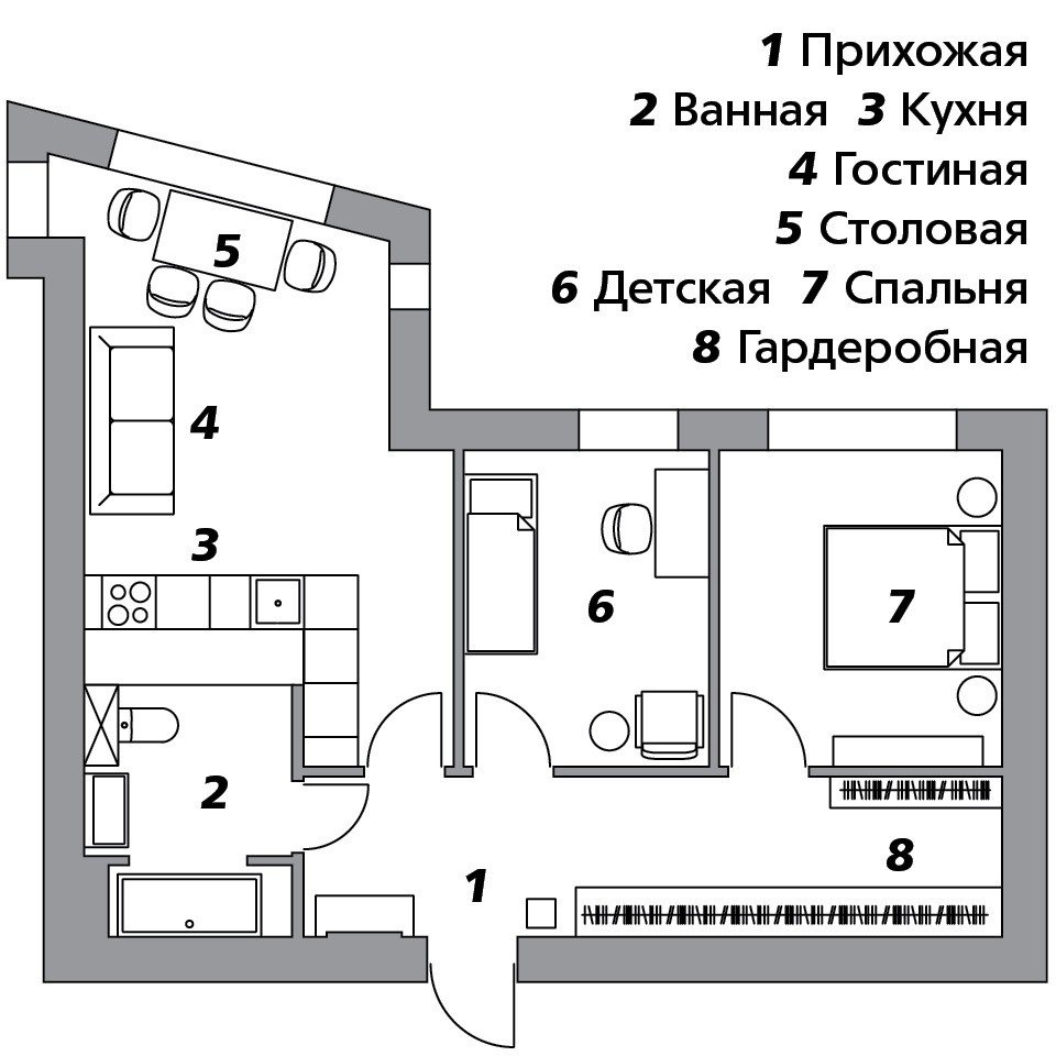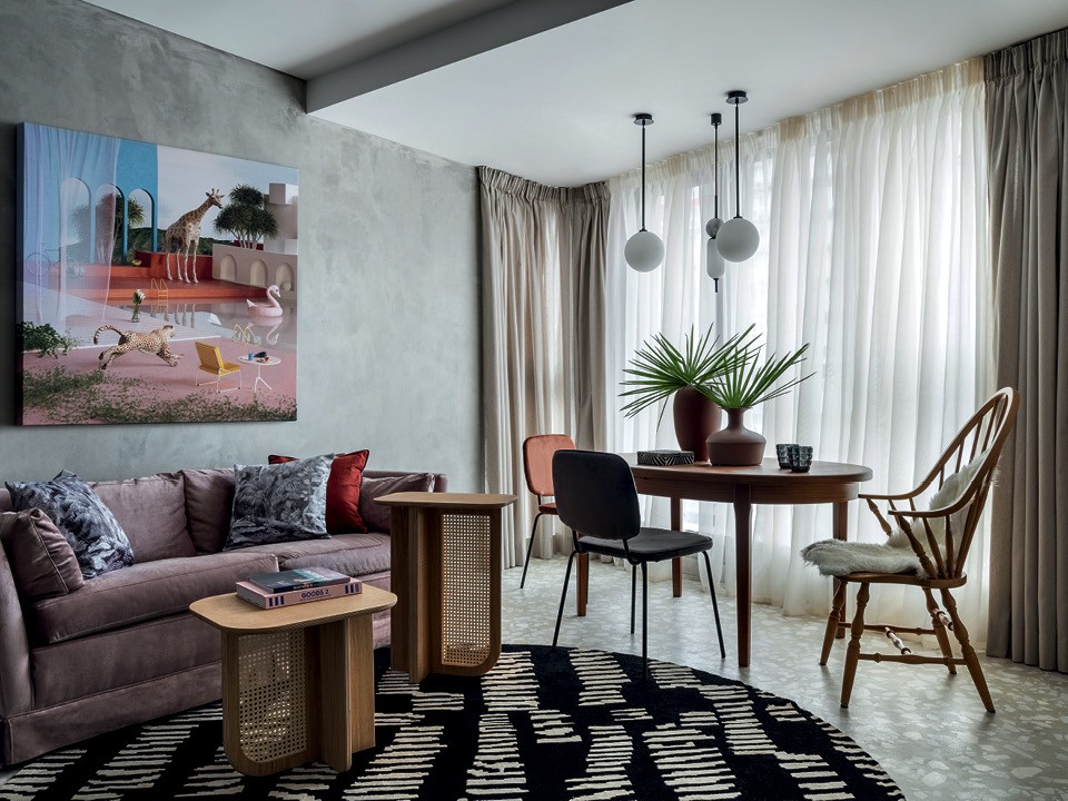 На плане видно, что в той части квартиры, где стоит обеденный стол, одна из стен расположена под углом. Чтобы визуально исправить геометрию пространства, дизайнер задрапировала окна и простенок между ними шторами, поставила овальный, а не прямоугольный стол, а вокруг него разные по форме стулья. Предметы отвлекают внимание от косой плоскости, а текстиль создает атмосферу уюта и визуально сглаживает острый угол.