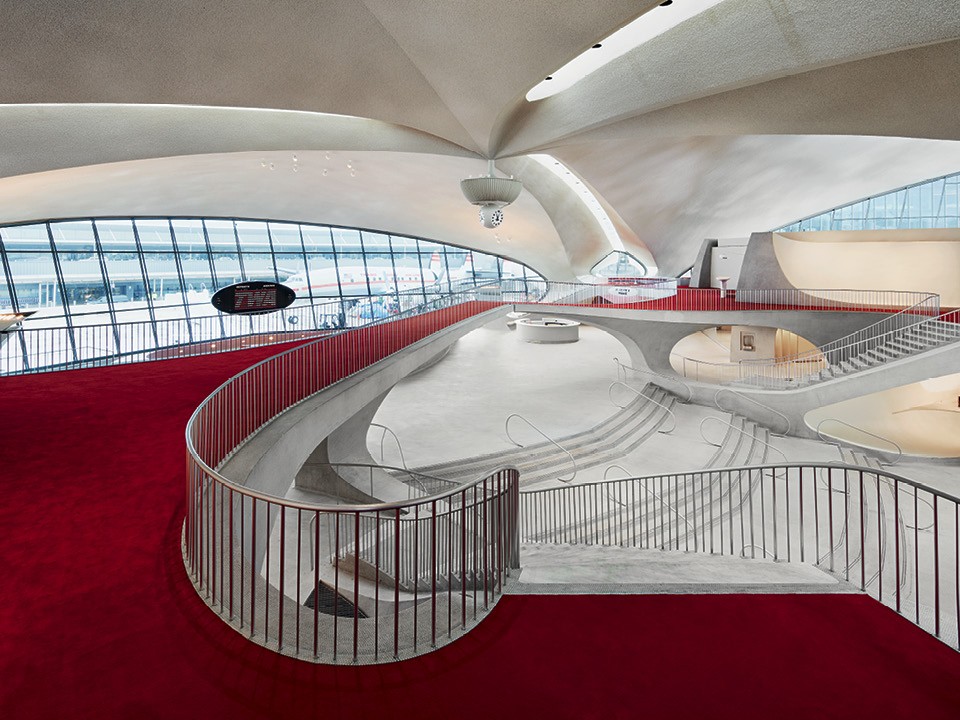 Когда в 1962 году открылся терминал TWA нью-йоркского аэропорта Джона Ф. Кеннеди, его сравнили с силуэтом чайки, и это неслучайно. Клиент, владелец крупной авиакомпании Trans World Airlines (TWA), хотел, чтобы архитектор Ээро Сааринен построил здание, олицетворяющее “дух полета”, а также отражающее мощь и инновационность набирающей обороты гражданской авиации. Американский архитектор финского происхождения четко выполнил задание, и могущественная птица, раскинувшая свои крылья по территории аэропорта JFK, произвела фурор. В 1990‑х терминал получил статус памятника, а в 2001 году закрылся и спустя восемнадцать лет обрел новую жизнь в качестве ретроотеля, который так и назвали TWA Hotel. Новые владельцы восстановили все интерьеры, над которыми помимо Сааринена работали Чарлз Имз, Раймонд Лоуи и Уоррен Платнер. Теперь прямо из пятого терминала JFK можно попасть в гостиничное лобби площадью 18 000 м², разместиться в номере, поплавать в бассейне и посетить музей, посвященный 1960‑м годам и дизайну того времени.