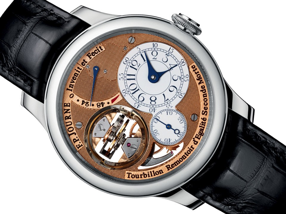Наручные часы Tourbillon Souverain — первая модель мануфактуры F.P. Journe, основанной мастером Франсуа-Полем Журном в 1999 году. К двадцатилетнему юбилею Журн усовершенствовал свое творение: он оснастил часы вертикально расположенным турбийоном, который совершает оборот за полминуты.