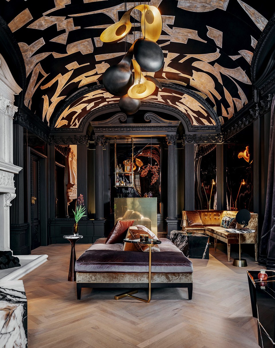 На выставке San Francisco Decorator Showcase, проходившей в мае этого года в Америке, дизайнер Мартин Кобус оклеил потолок своей интерьерной инсталляции под названием Recital новыми обоями Symphony от de Gournay. Геометрические фигуры на них позаимствованы из живописи абстракционистов середины ХХ века и выполнены из позолоченной фольги, а фоном для них служит крашеная бумага.