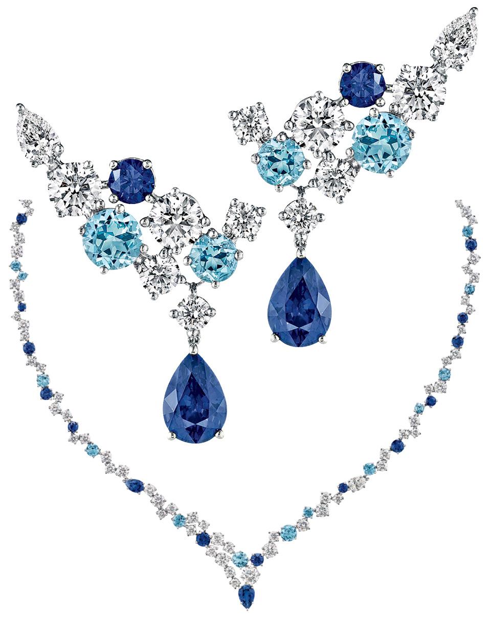Укра­ше­ния из кол­лек­ции Sparkling Cluster впол­не мо­гут кон­ку­ри­ро­вать с фо­то­гра­фи­я­ми кос­ми­че­ских да­лей. Юве­ли­ры Harry Winston до­пол­ни­ли брил­ли­ан­ты сап­фи­ра­ми и ак­ва­ма­ри­на­ми, вы­пол­нив в этом сти­ле не толь­ко ко­лье и серь­ги (на фото), но еще и коль­ца с браслетами.