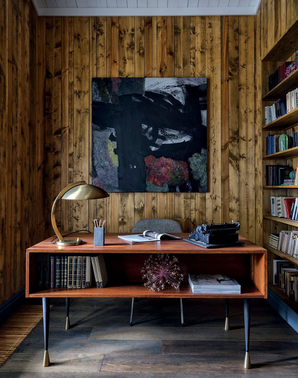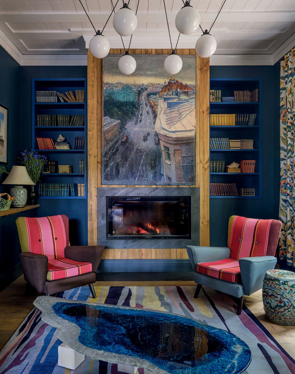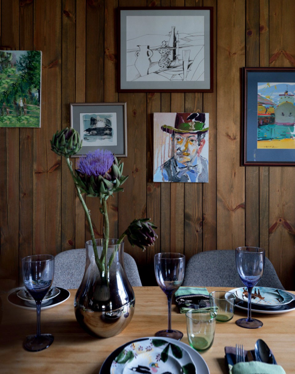 Гостиная с камином — единственная комната, которая отличается от всех остальных в доме: здесь стены выкрашены в сложный сине-зеленый цвет, а интерьер построен вокруг картины Владимира Брайнина — она висит на деревянном ризалите над камином. Он появился не случайно — так декоратор органично интегрировала сюда дерево, которое служит фоном повсюду в доме. “Эта комната задумывалась как созерцательная, — говорит Мия. — Мебель расставлена так, что все гости сидят лицом друг к другу и могут любоваться картинами, огнем в камине или видом на сад”. Для этого хозяйка отказалась от привычного в зоне гостиной дивана и поставила пять разных кресел.