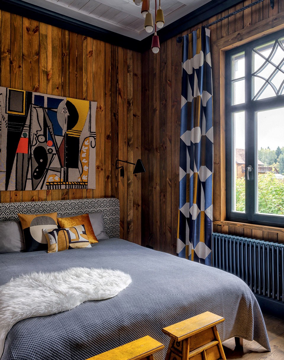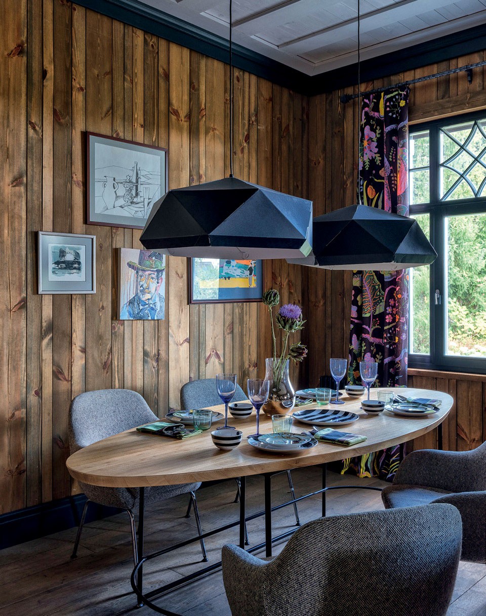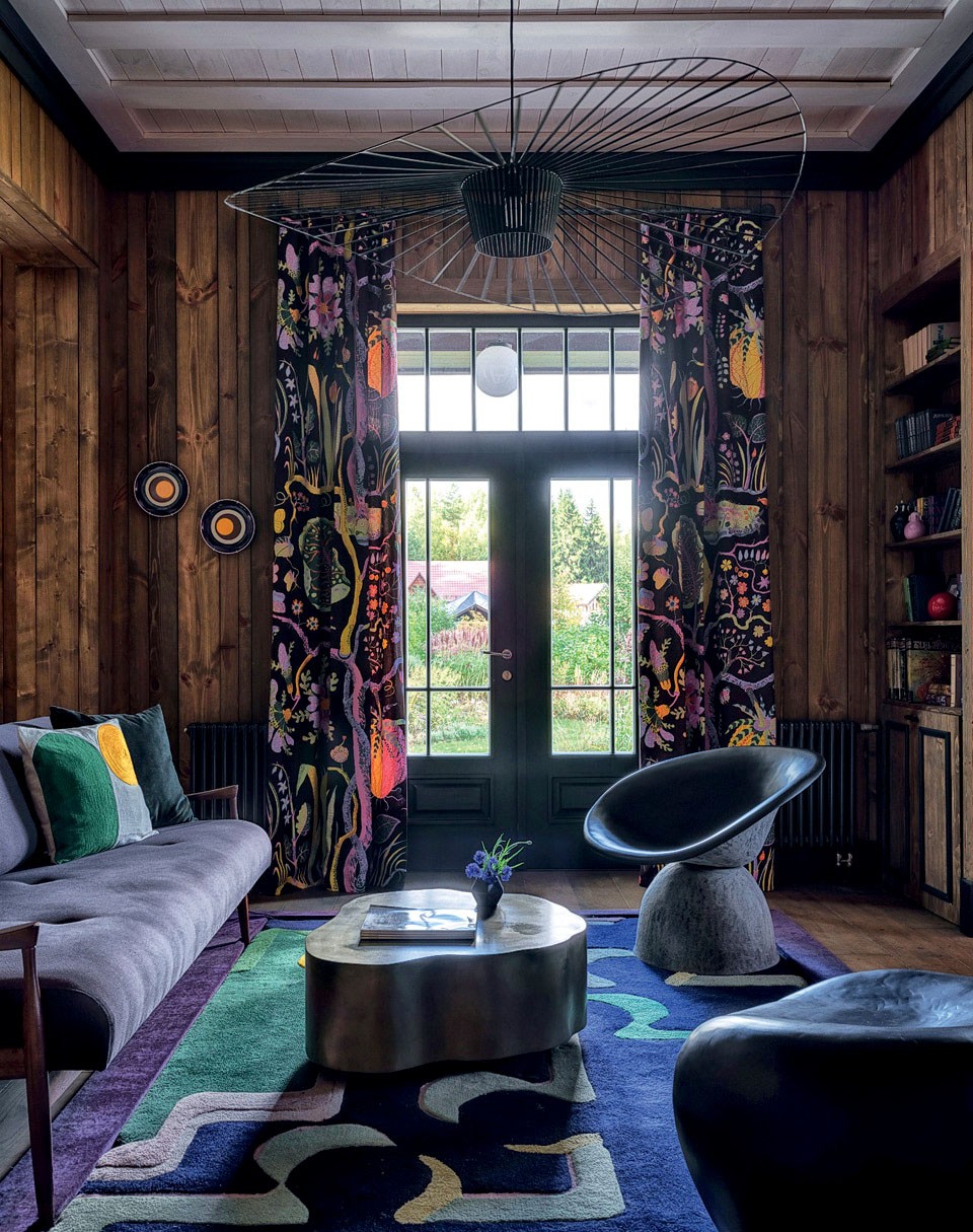 Построенный из бруса дом задавал определенный стиль, но декоратор захотела уйти от навязчивой рустики и обшила все стены вертикальными досками со сложным ритмом и тонировкой, которые долго подбирались. Фон получился довольно активным, поэтому для визуального баланса в интерьере появились не менее броские шторы с принтами по эскизам Йозефа Франка, знаменитого австрийского художника, наследие которого изучают в дизайнерских школах и демонстрируют в музеях всего мира. Мия нашла ткани по его эскизам в шоуруме шведской марки Svenskt Tenn в Стокгольме, который не менял свой адрес с 1924 года. “Мне нравятся сложные узоры и неожиданные коллаборации, — говорит декоратор. — К примеру, ковер в гостиной соткан на французской семейной мануфактуре Ateliers Pinton по эскизам начинающей дизайнерской студии Ma Poésie”. Дополняют обстановку английский винтажный диван и необычное кресло с пуфом современной итальянской марки Imperfetto Lab.